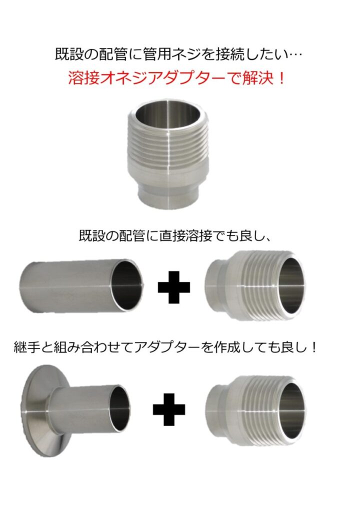 既設配管にそのまま溶接しても良し、ヘルールなど継手と組み合わせてアダプターを作成しても良しです!