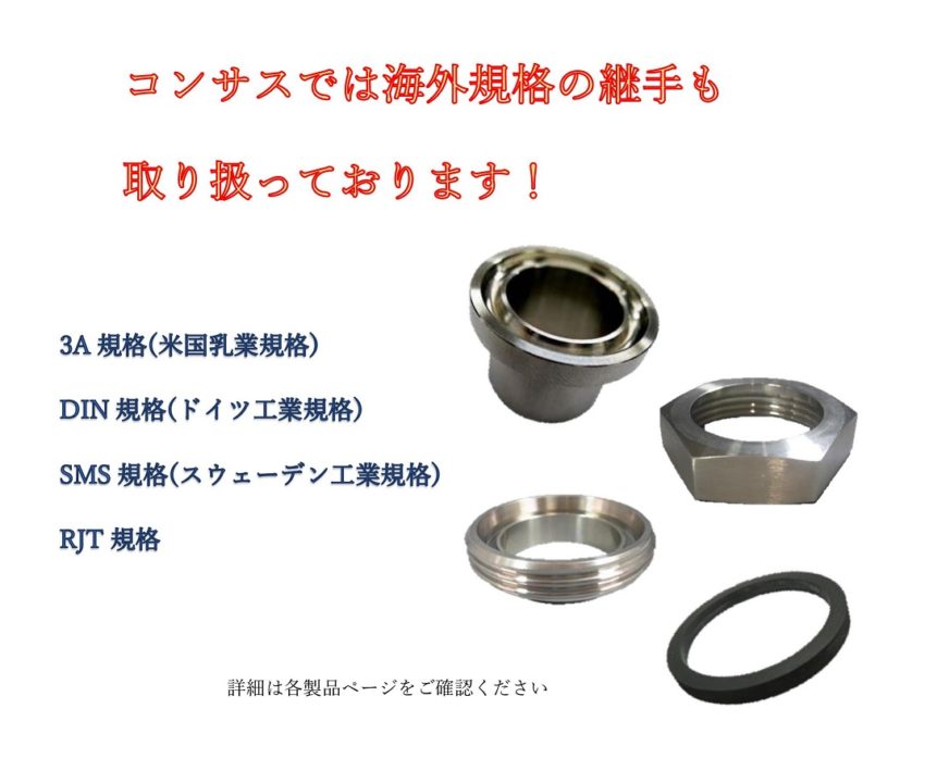 コンサスでは3A、DIN、SMS、RJT等の海外規格継手を多数取り扱っております。
