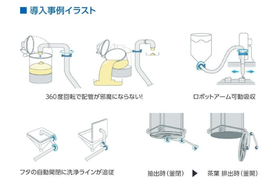 クランプの脱着なしで配管の向きを変更可能、漏れなく取り回しが出来ます。